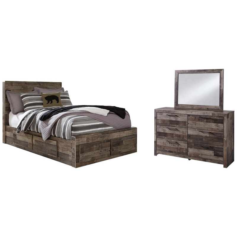 Walk the line between industrial and farmhouse styles with the modern heft of this panel storage bed and dresser with mirror. A rustic butcher block finish is tastefully roughhewn with appealing color variations and imperfections. Integrated storage in thi