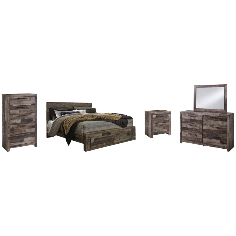 Derekson King Panel Bed with 2 Storage Drawers with Mirrored Dresser, Chest and Nightstand