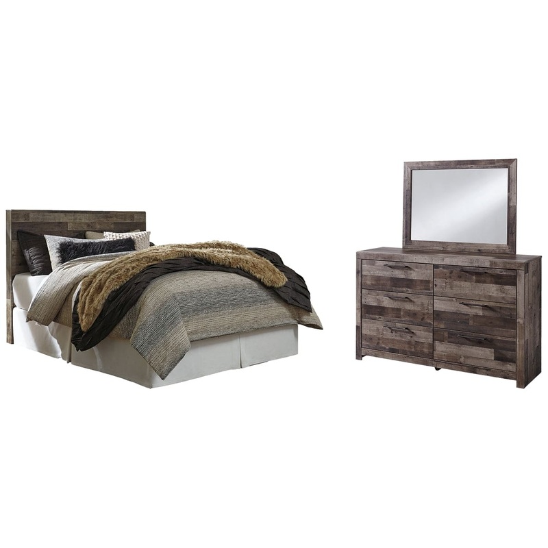 Walk the line between industrial and farmhouse styles with the modern heft of this panel headboard and dresser with mirror. A rustic butcher block finish is tastefully roughhewn with appealing color variations and imperfections. The substantial headboard is hearty and robust while the dresser provides roomy drawers with metal pulls in an antiqued gunmetal finish to complete this eclectic look.