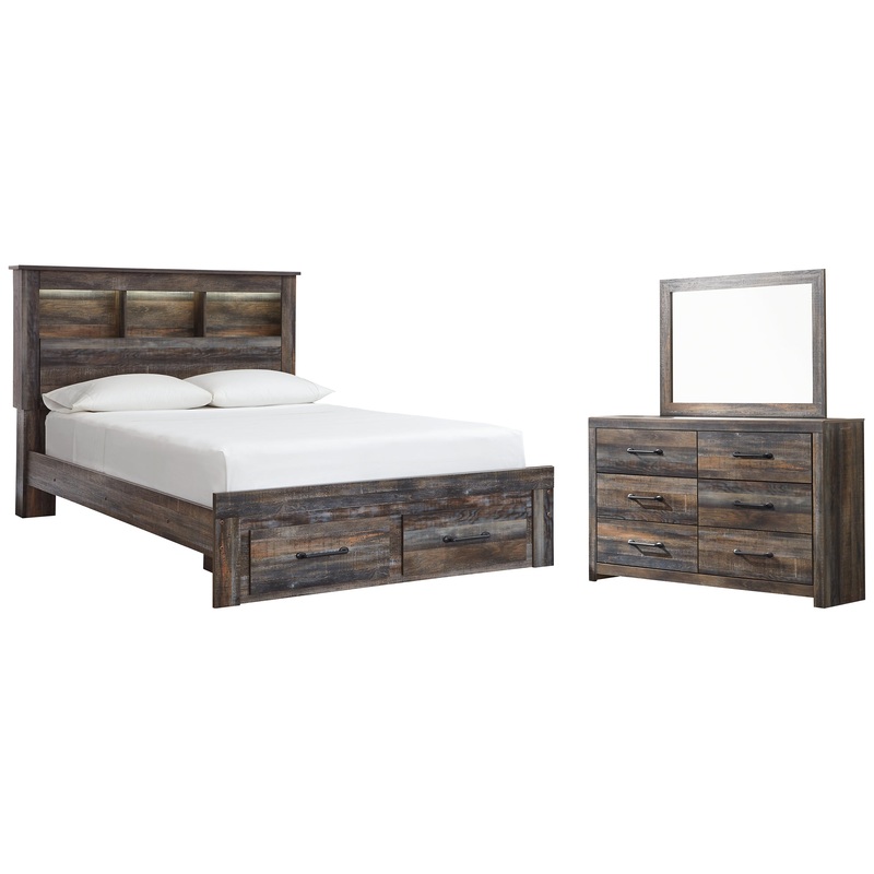 This queen-size bookcase bed with storage and dresser with mirror is a refined take on barn board beauty. Its complex, replicated wood grain showcases hints of burnt orange and teal tones for a sense of weatherworn authenticity. Three open cubbies lined with a dimming LED light strip keep bedtime reads top of mind. Double drawers at the foot of the bed come in mighty handy. The dresser with six smooth-gliding drawers lined with faux linen laminate and industrial dark-tone hardware complete this rustic and industrial style bedroom. Mattress and foundation/box spring available, sold separately.