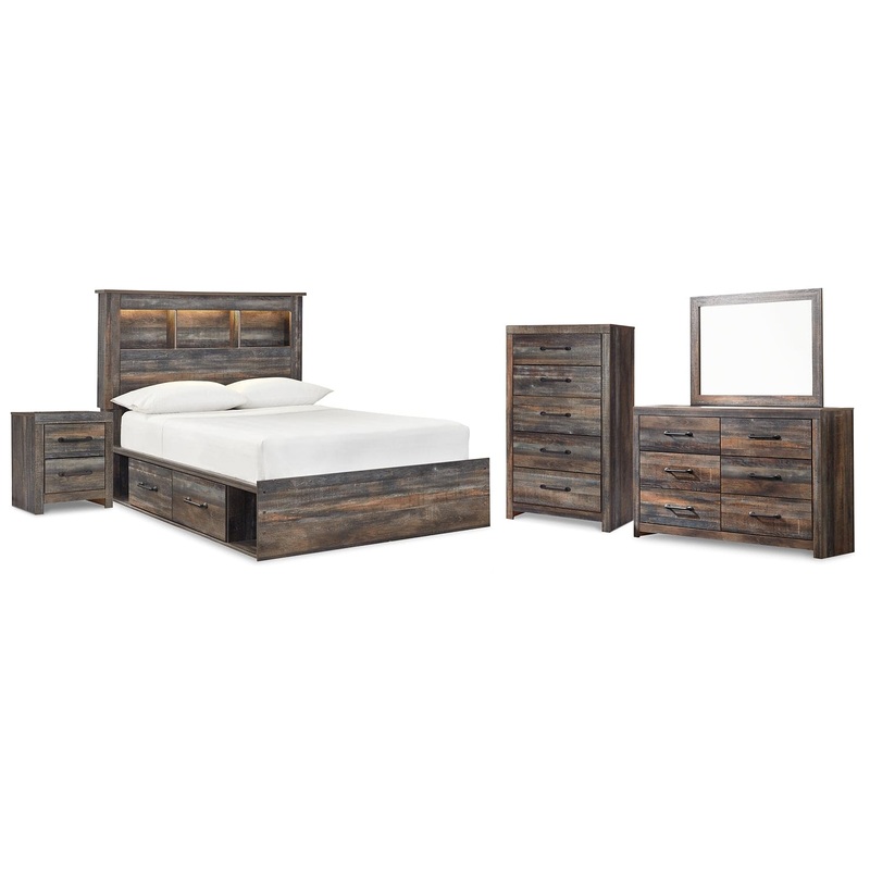 This full-size bookcase bed with storage, dresser, mirror, chest of drawers and nightstand is a refined take on barn board beauty. Its complex, replicated wood grain showcases hints of burnt orange and teal tones for a sense of weatherworn authenticity. Three open cubbies lined with a dimming LED light strip keep bedtime reads top of mind while underneath the bed is four smooth-gliding drawers and four open cubbies that accommodate casually cool storage bins. The dresser, chest and nightstand with smooth-gliding drawers lined with faux linen laminate and industrial dark-tone hardware complete this rustic and industrial style bedroom. Mattress and foundation/box spring available, sold separately.