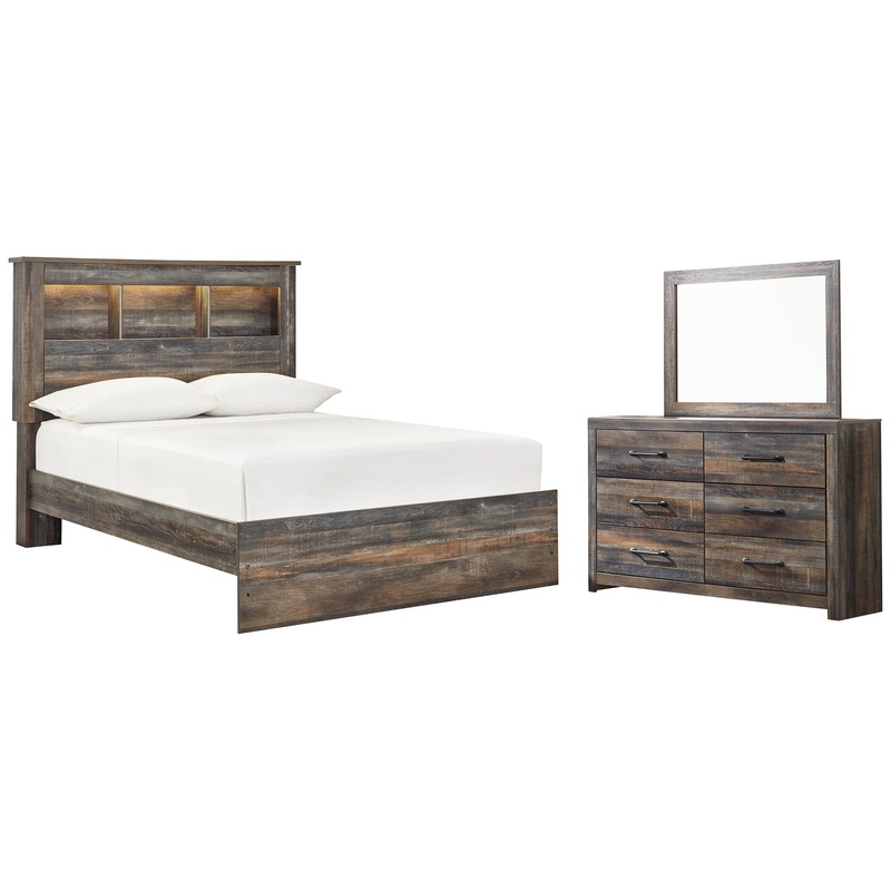 This full-size bookcase bed, dresser and mirror is a refined take on barn board beauty. Its complex, replicated wood grain showcases hints of burnt orange and teal tones for a sense of weatherworn authenticity. Three open cubbies lined with a dimming LED light strip keep bedtime reads top of mind. The dresser with six smooth-gliding drawers lined with faux linen laminate and industrial dark-tone hardware complete this rustic and industrial style bedroom. Mattress and foundation/box spring available, sold separately.
