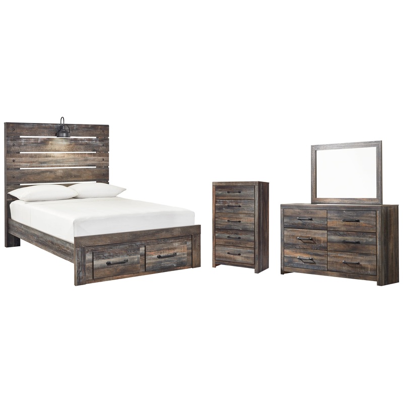 This full-size panel bed with storage, dresser, mirror and chest of drawers is a refined take on barn board beauty. Its complex, replicated wood grain showcases hints of burnt orange and teal tones for a sense of weatherworn authenticity. Double drawers at the foot of the bed also come in mighty handy. The dresser and chest with smooth-gliding drawers lined with faux linen laminate and industrial dark-tone hardware complete this rustic and industrial style bedroom. Mattress and foundation/box spring available, sold separately.