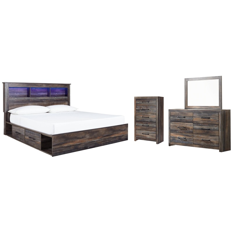 This king-size bookcase bed with storage, dresser, mirror and chest of drawers is a refined take on barn board beauty. Its complex, replicated wood grain showcases hints of burnt orange and teal tones for a sense of weatherworn authenticity. Three open cubbies lined with a dimming LED light strip keep bedtime reads top of mind while underneath the bed is a pair of smooth-gliding drawers and two open cubbies that accommodate casually cool storage bins. The dresser and chest with smooth-gliding drawers lined with faux linen laminate and industrial dark-tone hardware complete this rustic and industrial style bedroom. Mattress and foundation/box spring available, sold separately.