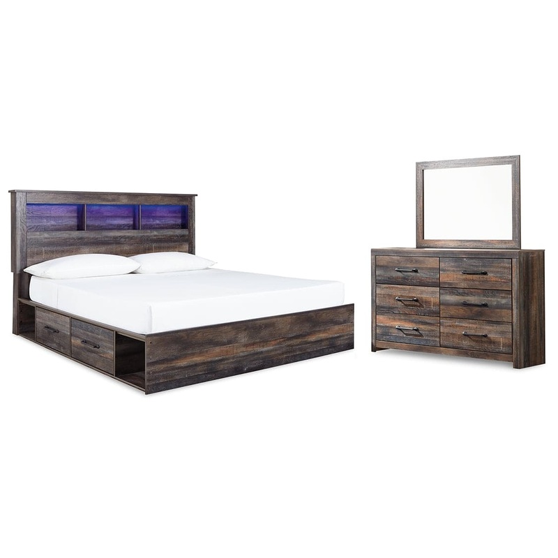This king-size bookcase bed with storage, dresser and mirror is a refined take on barn board beauty. Its complex, replicated wood grain showcases hints of burnt orange and teal tones for a sense of weatherworn authenticity. Three open cubbies lined with a dimming LED light strip keep bedtime reads top of mind while underneath the bed four smooth-gliding drawers and four open cubbies accommodate casually cool storage bins. The dresser with six smooth-gliding drawers lined with faux linen laminate and industrial dark-tone hardware complete this rustic and industrial style bedroom. Mattress and foundation/box spring available, sold separately.