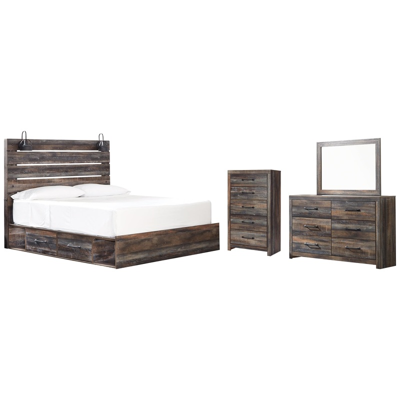 This king-size panel bed with storage, dresser, mirror and chest of drawers is a refined take on barn board beauty. Its complex, replicated wood grain showcases hints of burnt orange and teal tones for a sense of weatherworn authenticity. Love to read in bed? Youre sure to find the pair of retro-chic light sconces and USB plug-ins on the open-slat style headboard such a bright idea. Underneath the bed: four smooth-gliding drawers and four open cubbies that accommodate casually cool storage bins. Mattress available, sold separately. The dresser and chest with smooth-gliding drawers lined with faux linen laminate and industrial dark-tone hardware complete this rustic and industrial style bedroom. Mattress and foundation/box spring available, sold separately.