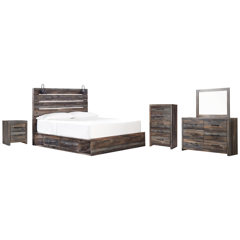 This king-size panel bed with storage, dresser, mirror, chest of drawers and nightstand is a refined take on barn board beauty. Its complex, replicated wood grain showcases hints of burnt orange and teal tones for a sense of weatherworn authenticity. Love to read in bed? Youre sure to find the pair of retro-chic light sconces and USB plug-ins on the open-slat style headboard such a bright idea. Underneath the bed: four smooth-gliding drawers and four open cubbies that accommodate casually cool storage bins. Mattress available, sold separately. The dresser, chest and nightstand with smooth-gliding drawers lined with faux linen laminate and industrial dark-tone hardware complete this rustic and industrial style bedroom. Mattress and foundation/box spring available, sold separately.