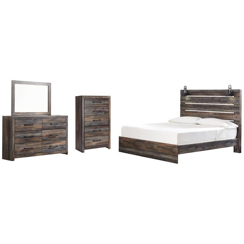 | Details | B211-46: Made of engineered wood (MDF/particleboard) and decorative laminate, Brown rustic finish with burnt orange and teal accents in a replicated wood grain with authentic touch, Large-scale hardware with dark finish, 5 smooth-gliding drawers, Drawer interiors are lined with a faux linen laminate for a clean, finished look, Includes tipover restraint device, Small Space Solution, Safety is a top priority, clothing storage units are designed to meet the most current standard for stability, ASTM F 2057 (ASTM International), Drawers extend out to accommodate maximum access to drawer interior while maintaining safety, B211B1: Made of engineered wood (MDF/particleboard) and decorative laminate, Brown rustic finish with burnt orange and teal accents in a replicated wood grain with authentic touch, 6 smooth-gliding drawers, Drawers lined with faux linen laminate, Dark-tone industrial hardware, Mirror attaches to back of dresser, Assembly required, Includes tipover restraint device, B211B14: Includes headboard, footboard and rails, Made of engineered wood (MDF/particleboard) and decorative laminate, Brown rustic finish with burnt orange and teal accents in a replicated wood grain with authentic touch, 2 decorative sconce LED lights, each runs on 3AA batteries, 2 USB charging ports, Power cord included; UL Listed, Foundation/box spring required, sold separately, Mattress available, sold separately, Assembly required, Bed is compatible with an adjustable base, |