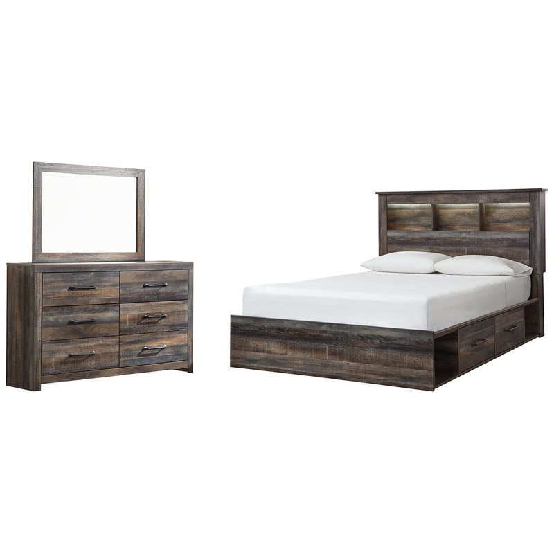 When merged in just the right way, rustic and industrial styles can make one happy marriage. Case in point: this bedroom set with bookcase bed with underbed storage and dresser/mirror. A refined take on barn board beauty, its complex, replicated wood grain
