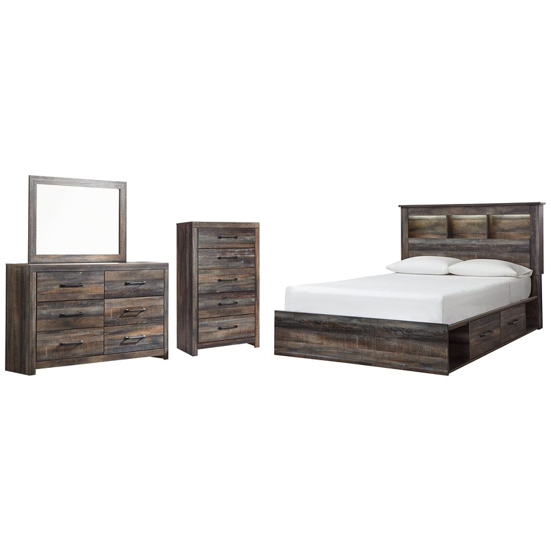 When merged in just the right way, rustic and industrial styles can make one happy marriage. Case in point: this bedroom set with bookcase bed with underbed storage, dresser/mirror and chest. A refined take on barn board beauty, its complex, replicated woo
