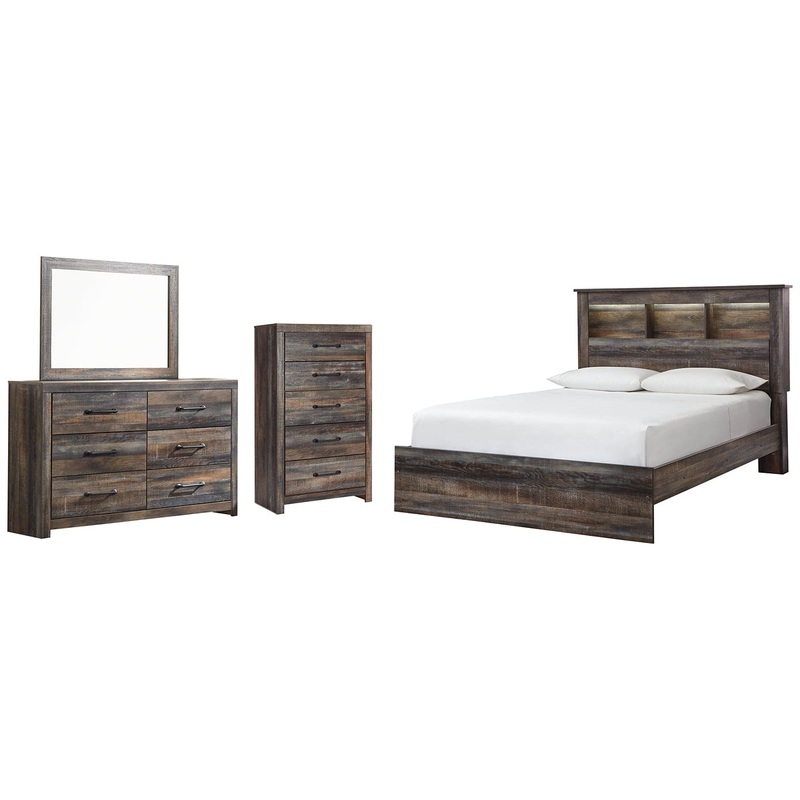 Drystan Queen Bookcase Bed with Mirrored Dresser and Chest