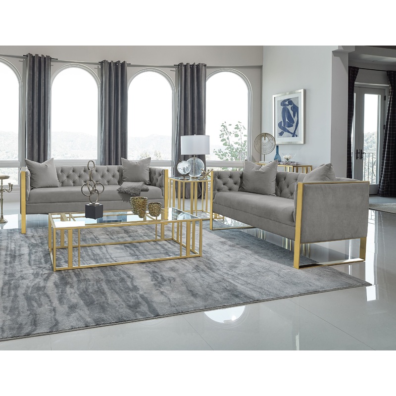Glamorous and stylish, this sofa and loveseat offers a formal touch of Hollywood Regency to a home. Both seats and wrapped in a light grey velvet upholstery, nestled by a sleek stainless steel arm and base in a lustrous gold finish. Each piece also offers a shelter style backrest and arms, with a button tufted interior. Each bottom cushion offers a smooth, yet tight waterfall style bench. Included in this set are four matching accent pillows.