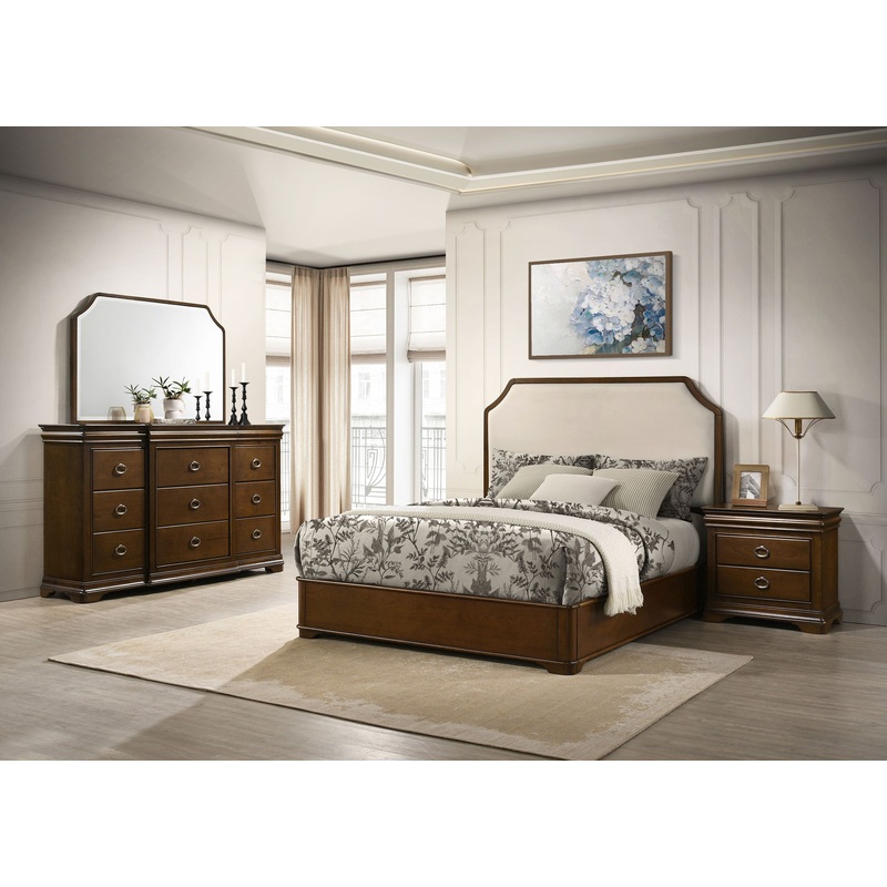 This bedroom set brings graceful elegance into the present with updated Louis Philippe styling. Each piece features crown molding, antique nickel ring pulls, and a warm brown cherry finish that radiates richness and charm. The bed softens the look with a cream upholstered headboard framed by sculpted rails and cutaway corners. Crafted from solid rubberwood, cherry veneer, and padded fabric, this collection blends timeless detail with modern comfort.