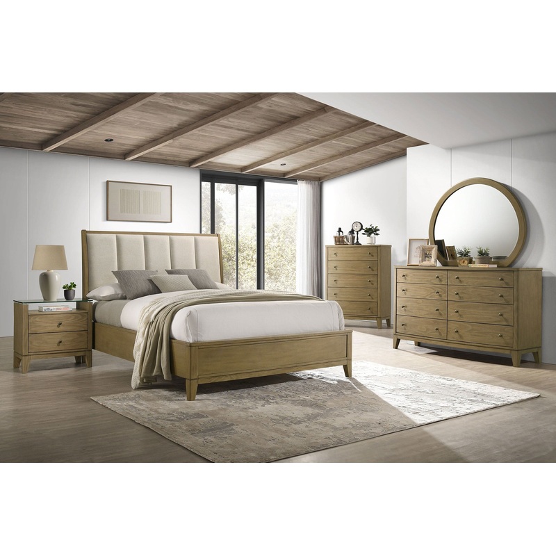 Elevate your bedroom with this five-piece set, offering a perfect blend of classic details and modern highlights. The set includes a bed, nightstand, dresser, mirror, and chest, all finished in a natural pine hue that complements the solid pine wood construction. The bed boasts a vertical channeled upholstered headboard, adding a touch of elegance. Each piece features softly curved fronts, square tapered legs, and antique nickel hardware, creating a cohesive and stylish look. Ideal for larger spaces, this set provides ample storage and timeless appeal.