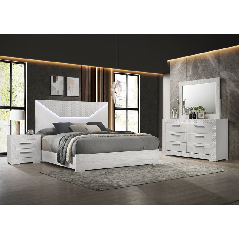 Create a cohesive and stylish look in your bedroom with this four-piece set, including a bed, nightstand, dresser, and mirror. The set features a high gloss finish and 3-dimensional diamond tile emboss, reflecting a contemporary Italian style. Each piece is crafted with quality materials and attention to detail, offering both beauty and functionality. The bed includes a touch LED light in the headboard, while the dresser and nightstand provide ample storage with felt-lined top drawers. This bedroom set is perfect for those seeking a modern and elegant aesthetic.