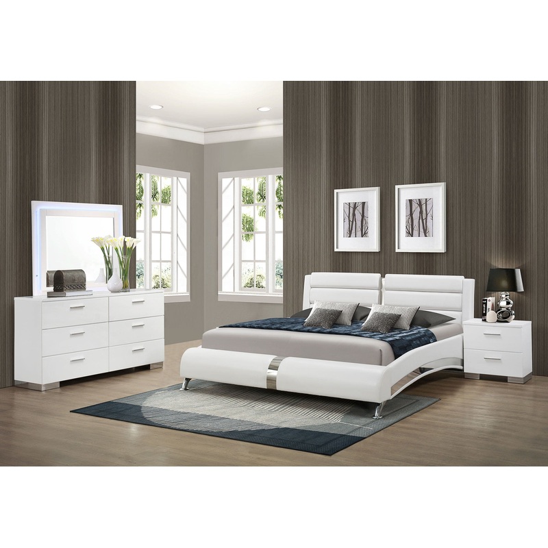 Outfit your modern bedroom with the energizing look of this bedroom set. Clean lines on case pieces contrast with the alluring curves of a stylish bed with a sectioned headboard and sleek chrome finish metal accents. Dresser, and nightstand drawers operate smoothly on extension glides, with all drawers featuring felt lining to protect valuables and metal legs and drawer pulls magnifying a contemporary vibe. Embrace the convenience of a rectangular framed mirror with beveled glass and an LED light strip operating through touch. Set includes one bed, one two-drawer nightstand, one six-drawer dresser, and one LED lighted mirror.