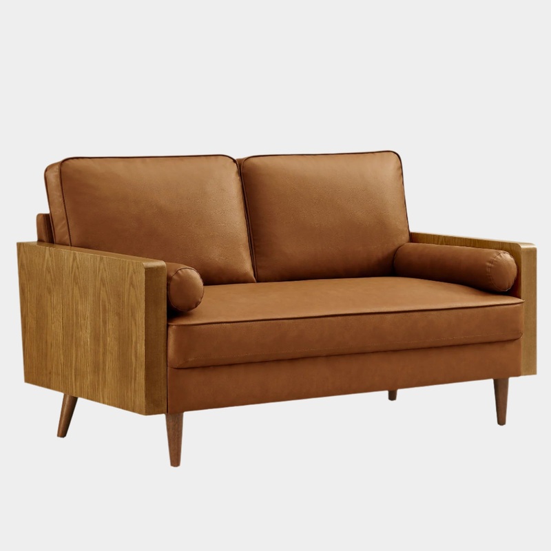 A statement piece for the discerning home, the Kellan Faux Leather Loveseat brings together style and comfort in an updated retro design. This loveseat sofa is upholstered in smooth vegan leather, offering a chic, sleek look that fits perfectly in small spaces. The beautiful wood grain armrests, crafted from rich veneer, add a touch of natural warmth to its mid century modern contemporary aesthetic. Supported by tapered wood legs with non-marking floor glides, this small space loveseat offers both style and practicality, protecting your flooring while enhancing the ambiance of a living room, bedroom, office, or reception area. High-density foam padding and zigzag spring support provide a premium seating experience, while the down feather blend of the back and bolster cushions add an extra layer of luxury. Whether as a loft loveseat or a comfortable living room sofa for relaxing, the Kellan is a versatile studio couch that will elevate your space with its refined style and supportive comfort. Assembly required. 2 Seater Loveseat Weight Capacity: 800 lbs.