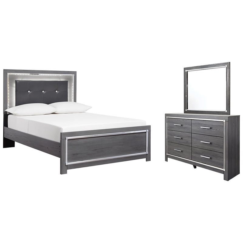 | Details | B214B1: Made of engineered wood (MDF/particleboard) and decorative laminate, Gray finish with replicated wood grain, Faceted chrome-tone pulls and accents, 6 smooth-operating drawers, Drawers lined with faux linen laminate, Mirror attaches to back of dresser, Includes tipover restraint device, Assembly required, B214B4: Includes headboard, footboard and side rails, Made of engineered wood (MDF/particleboard) and decorative laminate, Gray finish with replicated wood grain, Faux leather upholstery, Faux crystal and faceted chrome-tone metal accents, Accent LED lights with remote to control color and brightness, Power cord included; UL Listed, Mattress and foundation/box spring available, sold separately, Assembly required, Bed is compatible with an adjustable base, |