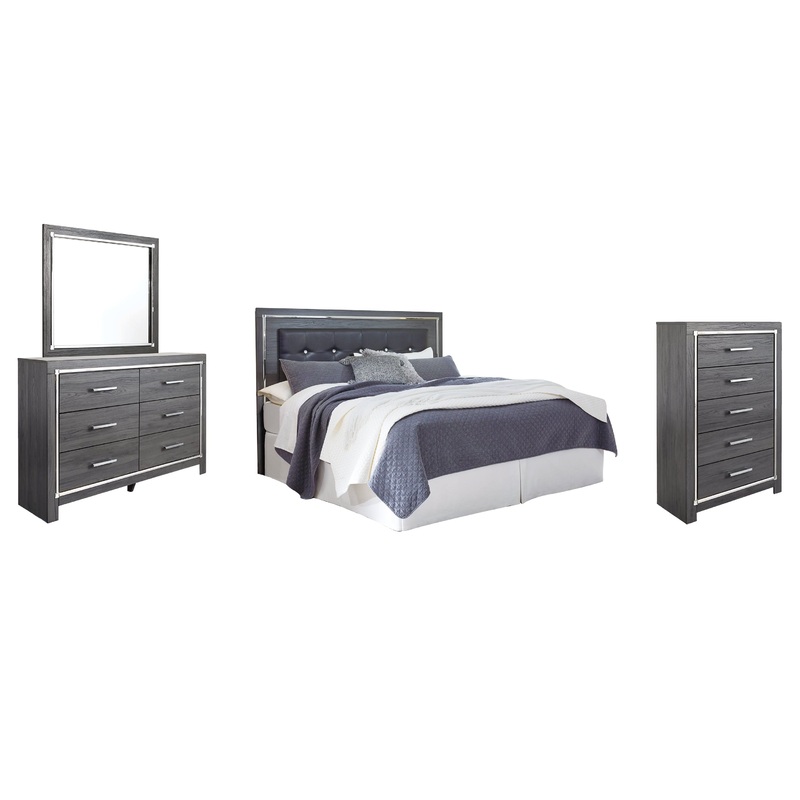 Reminiscent of Hollywood glamour of yesteryear, this bedroom set with king/California king panel headboard, dresser/mirror and chest interprets luxury in a decidedly modern way. Headboard details include button-tufted upholstery, faceted faux crystals and LED lights enhanced with remote-controlled settings for color and brightness. Chrome-tone drawer pulls and accents are a chic complement to the dazzling gray finish.