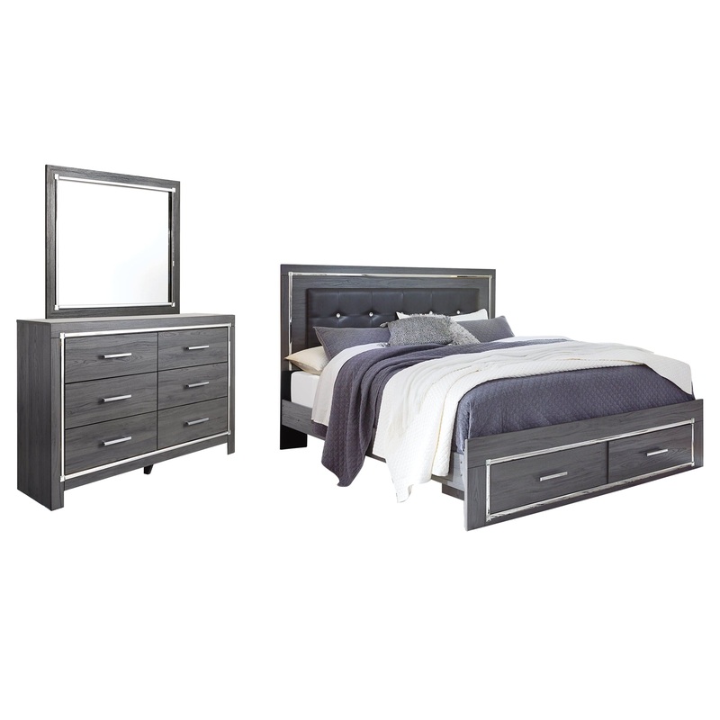 | Details | B214B1: Made of engineered wood (MDF/particleboard) and decorative laminate, Gray finish with replicated wood grain, Faceted chrome-tone pulls and accents, 6 smooth-operating drawers, Drawers lined with faux linen laminate, Mirror attaches to back of dresser, Includes tipover restraint device, Assembly required, B214B11: Includes headboard, storage footboard and side rails, Made of engineered wood (MDF/particleboard) and decorative laminate, Gray finish with replicated wood grain, Faux leather upholstery, Faux crystal and faceted chrome-tone metal accents, Accent LED lights with remote to control color and brightness, 2 smooth-operating drawers, Power cord included; UL Listed, Foundation/box spring required, sold separately, Mattress available, sold separately, Assembly required, Bed is not compatible with an adjustable base, |