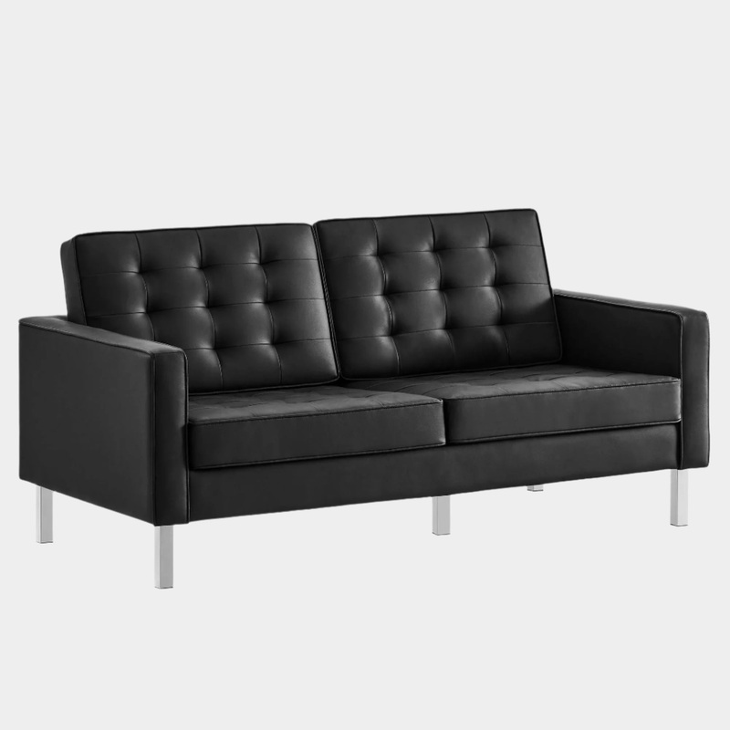 Revolutionize your living room furniture with the iconic Loft Vegan Leather Loveseat. Adding visual depth to your living room or lounge space, Loft features soft and durable vegan leather upholstery accented with classic biscuit tufting. This modern loveseat showcases a captivating linear design, tubular stainless steel legs, and non-marking foot caps that protect flooring. Inspired by the richness of mid-century modern style, this two-seater sofa is an ideal choice for living rooms, office reception areas, and lounge spaces. Loveseat Weight Capacity: 660 lbs.