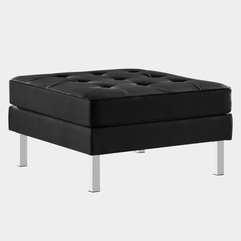 Revolutionize your living room furniture with the iconic Loft Vegan Leather Ottoman. Adding visual depth to your living room or lounge space, Loft features soft and durable vegan leather upholstery accented with classic biscuit tufting. This modern ottoman showcases a captivating linear design, tubular stainless steel legs, and non-marking foot caps that protect flooring. Inspired by the richness of mid-century modern style, this upholstered ottoman is an ideal choice for living rooms, office reception areas, and lounge spaces. Ottoman Weight Capacity: 330 lbs.
