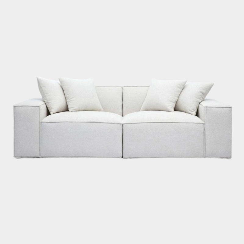 The Mindy Modular collection delivers cozy texture and standout style with its soft chenille basketweave, thick stitching, and plush accent pillows. Built for comfort with deep seating and endless configuration options, it's available in cream, charcoal, o
