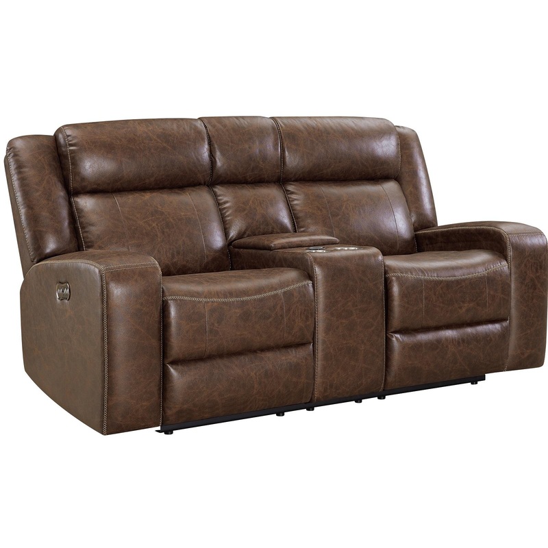 Atticus Collection by New Classic Furniture Mocha finish Power reclining With power footrest Whip Stitch Lighted Sofa Center Cushion with Power Pack and Cup Holders, Console Love with Stainless Cup holders, Wireless Charging Pad Pocket Coil Cushion KD Back