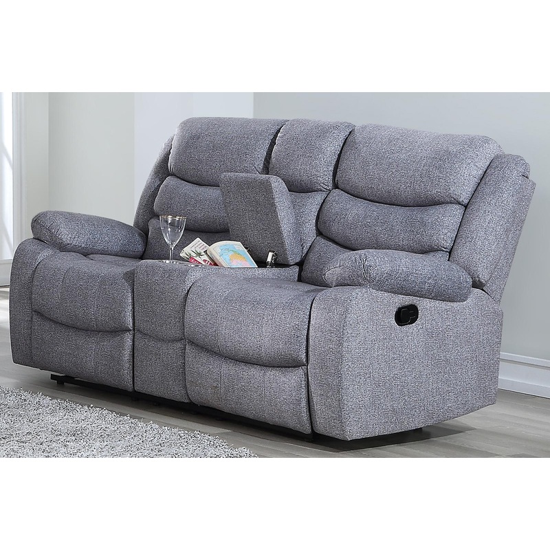 Granada Collection by New Classic Furniture Gray finish Hardwood and plywood frame Pocket coil cushion Tufted seat and back With console Holds up to 2 glasses