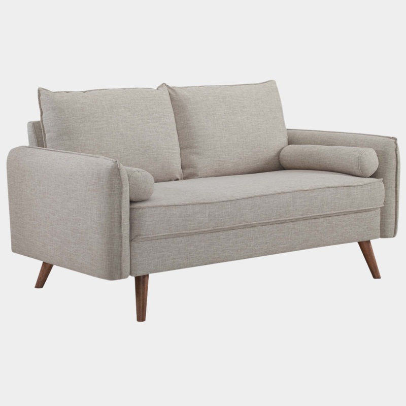 Give new vitality to your home or apartment living space with Revive. With a comfortable yet tailored profile and two bolster pillows, Revive beckons guests to sit and stay a while. Its soft fabric upholstery grants this loveseat an approachable appeal thats echoed by its calming color, clean lines, and splayed wood legs. Arriving directly to your doorstep in a convenient shipping box, Revive easily unpacks to quickly become the most well-loved lounge spot in your home.
